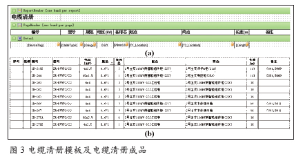 电缆清册数字化设计。数字化设计软件能实现电缆清册的精确开列。山南变电缆清册通过配置模板,从工程数据库中提取电缆信息自动生成,保证了原理图和电缆清册信息的一致。只要原理图绘制正确,电缆清册就可避免错漏。电缆清册模板(图3(a))和电缆清册成品(图3(b))如下图所示。通过使用统一的电缆清册模板,可实现电缆清册的标准化;电缆清册格式变化时,只需修改电缆清册模板即可重新生成电缆清册。