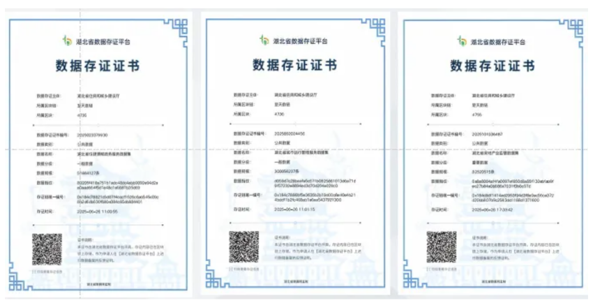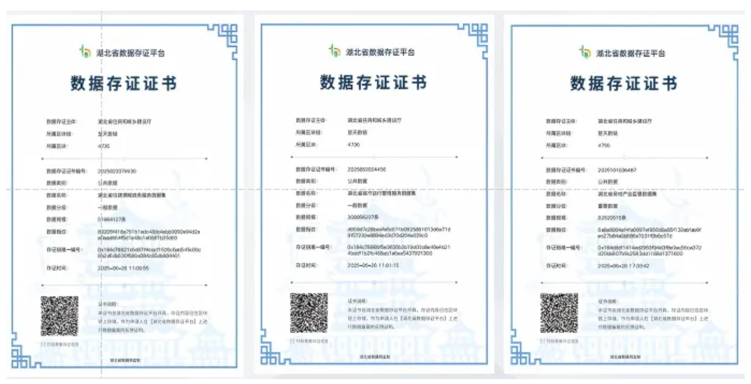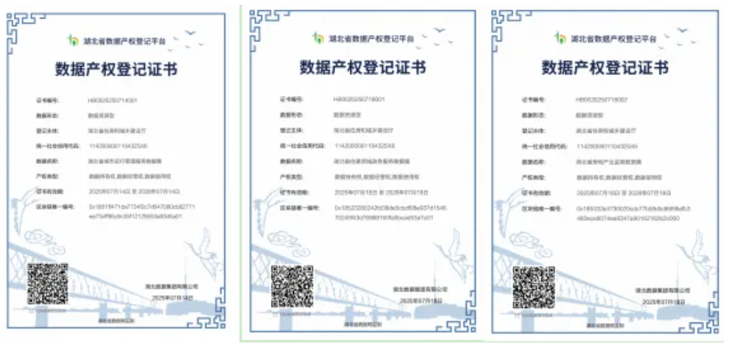 数据资源确权。建立数据资源确权工作小组,联合湖北大数据集团、律师事务所集中办公,高效推进。委托律师事务所,根据《湖北省住房和城乡建设厅三定方案》《数据集情况说明》《数据资源清单》等材料,出具了3个数据集的数据合规法律意见书,在湖北省数据产权登记平台进行了数据产权登记,已取得3个数据集的产权登记证书,确认了省住房城乡建设厅具有3个数据集的数据持有权、数据经营权和数据使用权,完成了数据资源的确权工作。