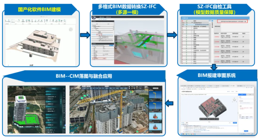 采用了 SZ-IFC 存储标准,解决异构 BIM模型格式的中立性问题,实现了多源一模,促进模型数据流通和应用。基于 SZ-IFC 存储标准,实现 BIM 模型“建 - 收 - 查 - 管 - 用”全流程应用链条。建 :ArchiCAD、Tekla、BIMBASE 主流建模软件转换成 SZ-IFC 格式的工具建设,其中 BIMBASE 作为国产建模软件支持检索。收 :以统一服务平台提供接口服务方式,支撑各业务系统在各自业务中实现模型统一收集。查 :基于建模手册要求,以 MVDLITES 作为质检规则,对模型进行合标性检查 ;管 :以项目周期、模型精度、工程类别等作为划分维度,对模型进行数据资产划分。用 :建设统一服务平台,支撑各业务系统接入,统一封装 BIM 基础服务能力和数据服务。