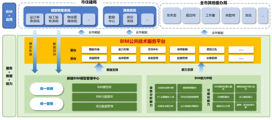 深圳市住房和建设局通过服务门户为全市政务用户提供 8 大类 BIM 基础能力(轻量化能力、图模联审、合标性检查、基点一致性检查、点云实模对比、扩展属性挂载等),已成功支持局内外 8 个业务系统对接服务平台,实现 BIM 模型数据与 BIM 基础能力结合使用。